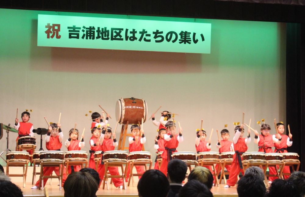 太鼓を引いて練り歩く幼い法被姿の子らの行列。怪我をしないように、祭り関係の大人や保護者が付き添っていました。吉浦カニ祭りは、毎年10月の第一日曜日に繰り広げられます。