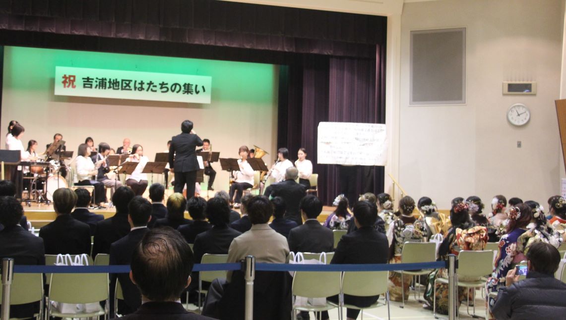 会場に流れる軽快な音楽を耳にしながら、療法士のリードで体をねじったり伸ばしたり、爽やかな汗をかく参加した吉浦町民