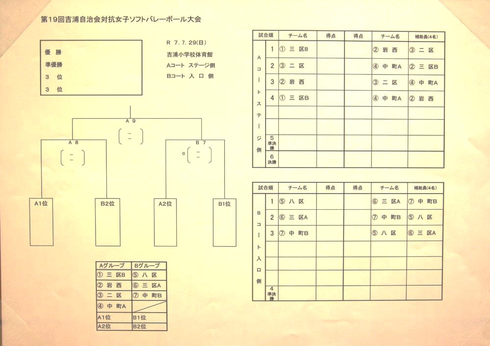 体育館内に貼り出された自治会対抗の一覧表。この女子ソフトバレーボール大会は、コート二面で行われました。