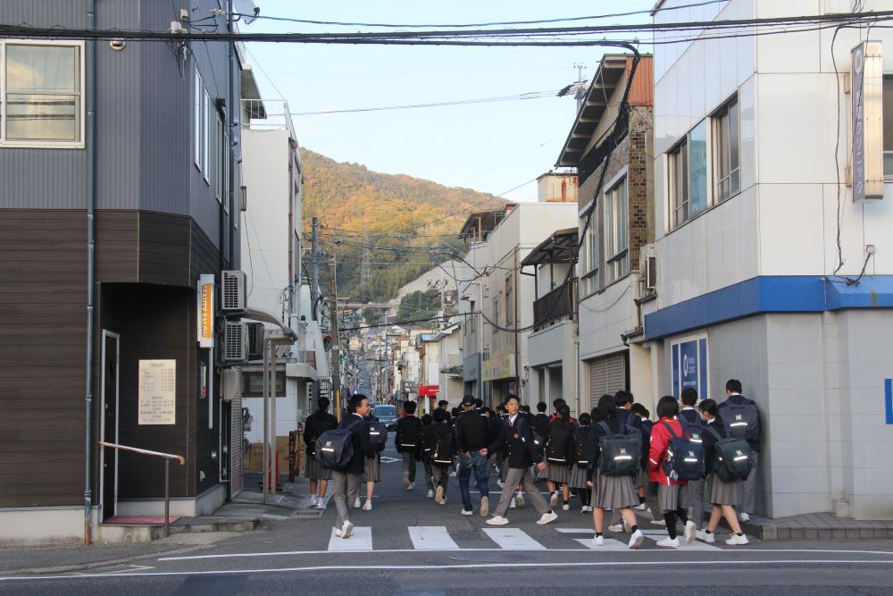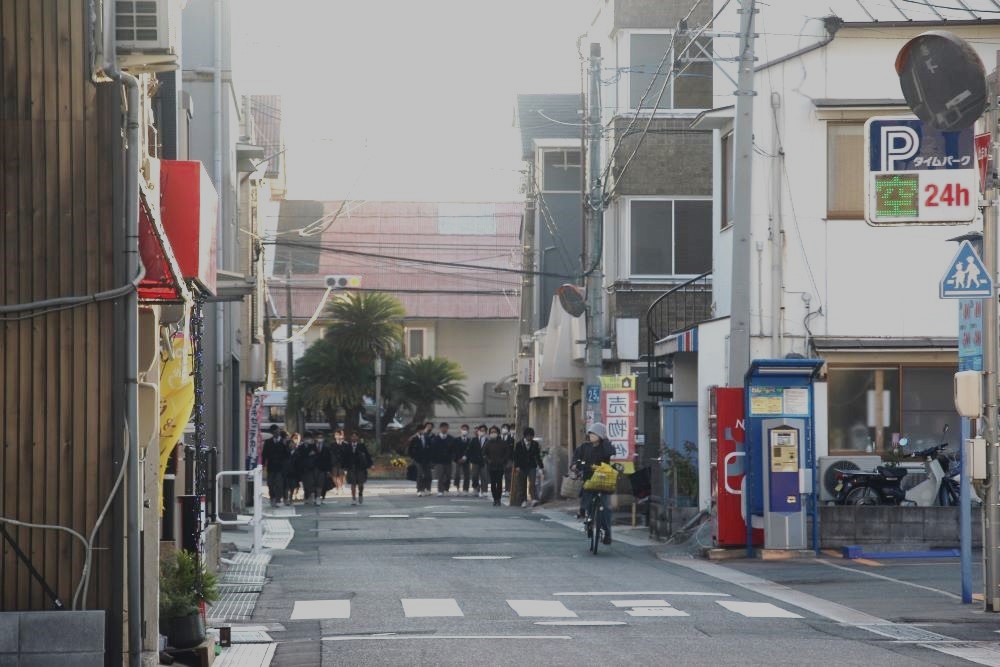 吉浦中学生は、のんびりしていません。青色信号になったら、もう走っちゃうんです。みなぎる若さを感じます(JR吉浦駅前で)