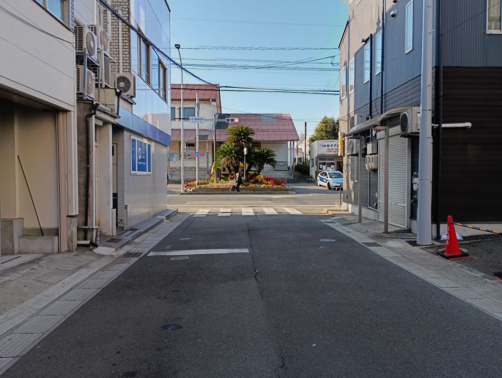 街の景色は、時の流れとともに移ろう。この道は、JR呉線の吉浦駅正面から、まっすぐ伸びて茶臼山の襞が見通せます。吉浦中学生が電車から降りて、家路にむかうこの道には、ついこの間まで「吉浦本町商店街のアーケード」がありました。アーケードの屋根も柱も、もう見るかげもありません。アーケードという建造物を撤去した道は、空高く広い道となって、人と車が行き来する焼山吉浦線の県道278号線であり、「吉浦街道」とも地元の人は言っています。(吉浦本町1丁目)