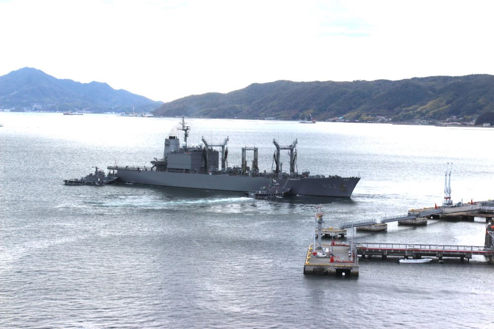 補給を終え、2隻のタグボートに誘導されて、吉浦の海自基地を離岸する補給艦「とわだ」