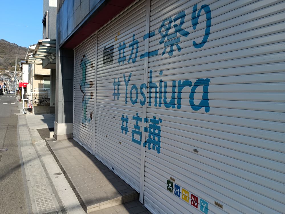 呉服店だったこのシャッターには、「吉浦カニ祭り」の文字が飛び込んできました。