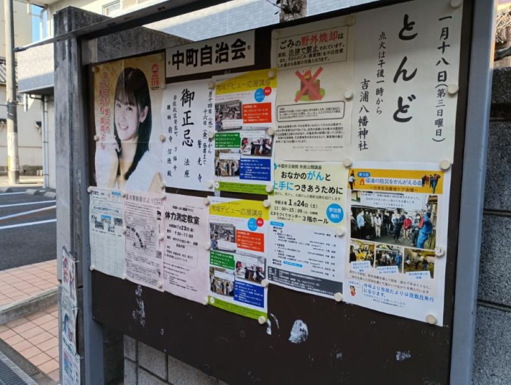 吉浦町内の各所に立てられている掲示板には、いろんな情報チラシが貼られます。バラエティなチラシに、つい引きつられ、立ち止まって見るというか、読んでしまう