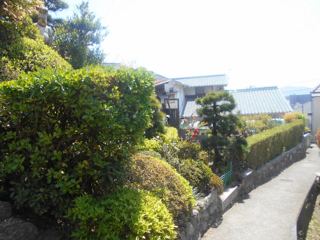 吉浦の街なかは、くもの巣のように、細い路地がいっぱいあります。そういう路地巡りの散歩は、気分を爽快にしてくれます。藤の花が咲く頃は、紫の花房をみあげながら、ゆっくりこの細道を通りぬけるのが楽しみにです。向こうの山は、魚見山連山の一部。