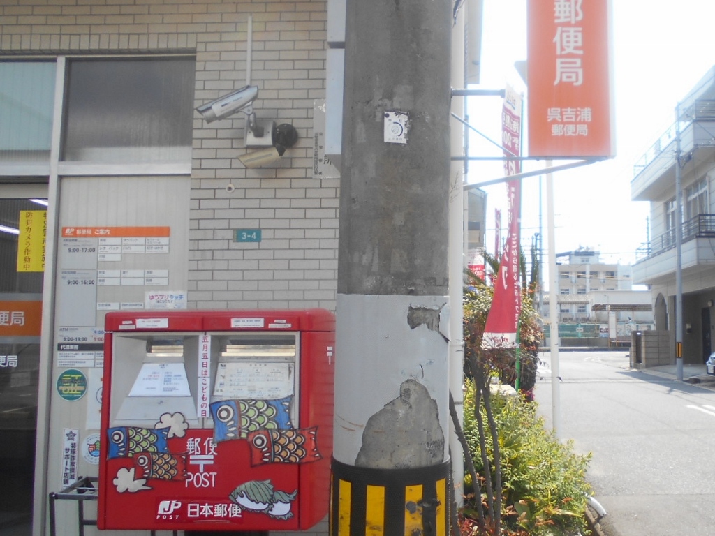 町内には、赤いポストがあちこちに設置されていますが、鯉のぼりのあるポストは、吉浦郵便局前のポストだけ。見ていると、楽しくなってきますよね。