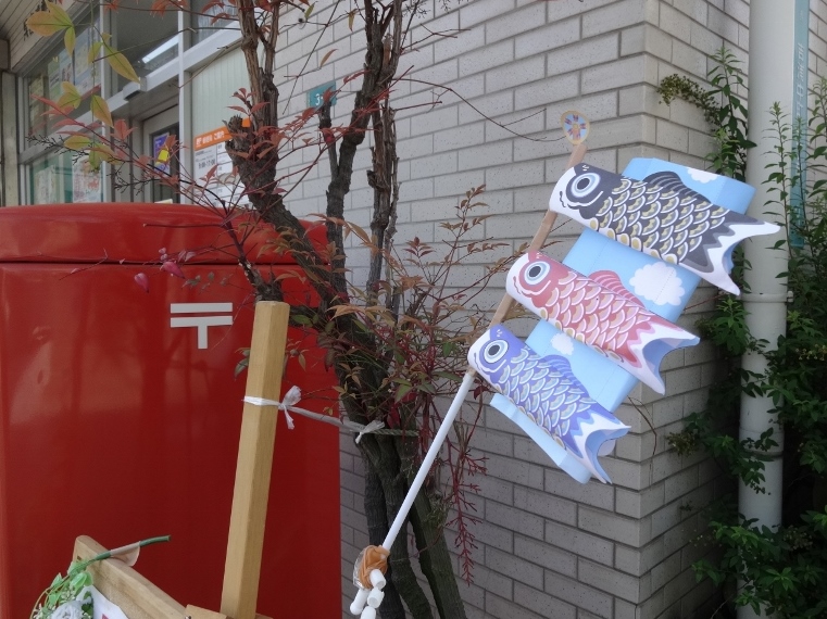 吉浦郵便局に切手を求めに出かけました。普段は赤い郵便ポストがあっても、目にとまることはありません。ところが、オヤッと一目をひきました。ポストに真鯉と緋鯉の鯉のぼりのシールステッカーが二組はりつけてあるからです。白っぽい雲までつけてありました。子供の健やかな成長への願いが伝わってきました。そして、右下のには、端午の節句に食べる柏餅のステッカーがふたつ。「五月五日はこどもの日」と赤い文字ありました。郵便局の乙な心になごみました。