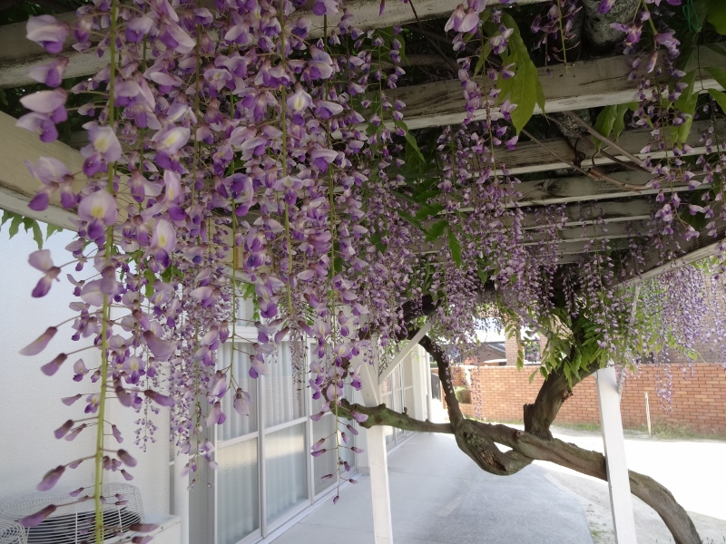 集会所の広場には、藤棚があります。咲く季節になると、薄紫の藤の花が垂れ下がり、心がなごみます。