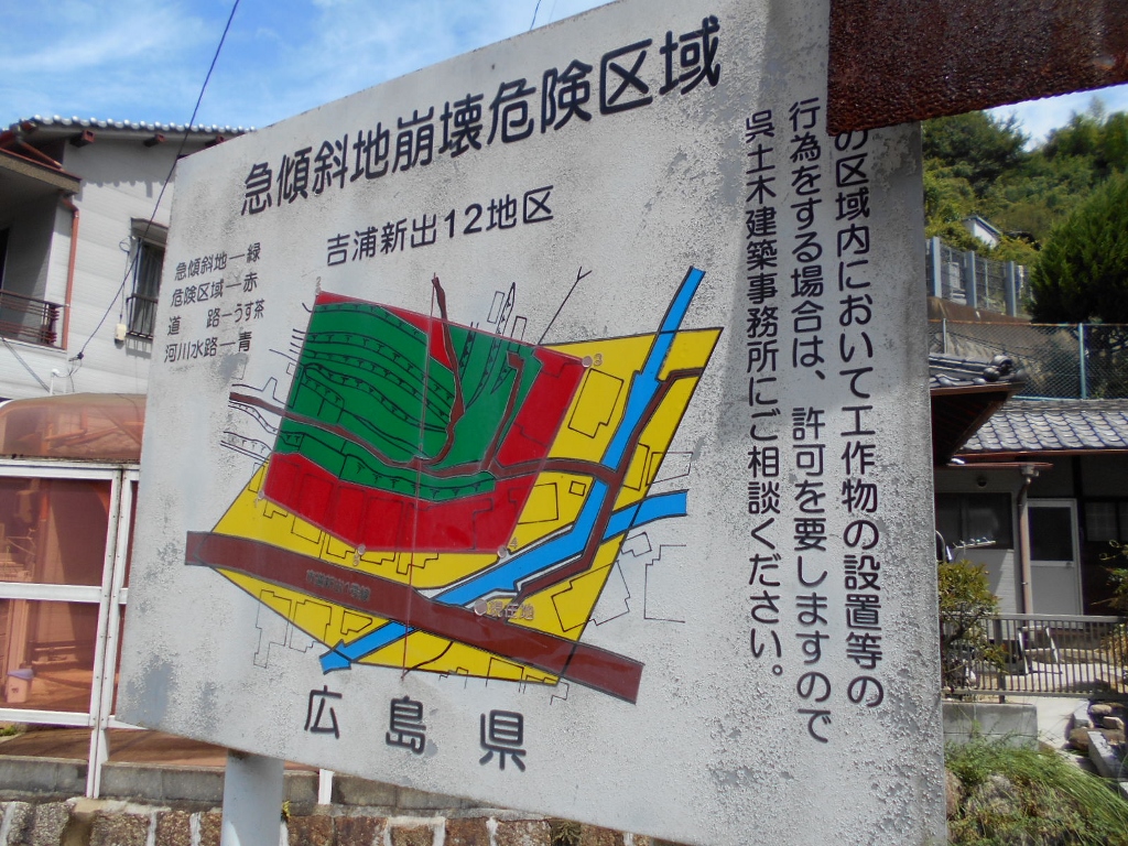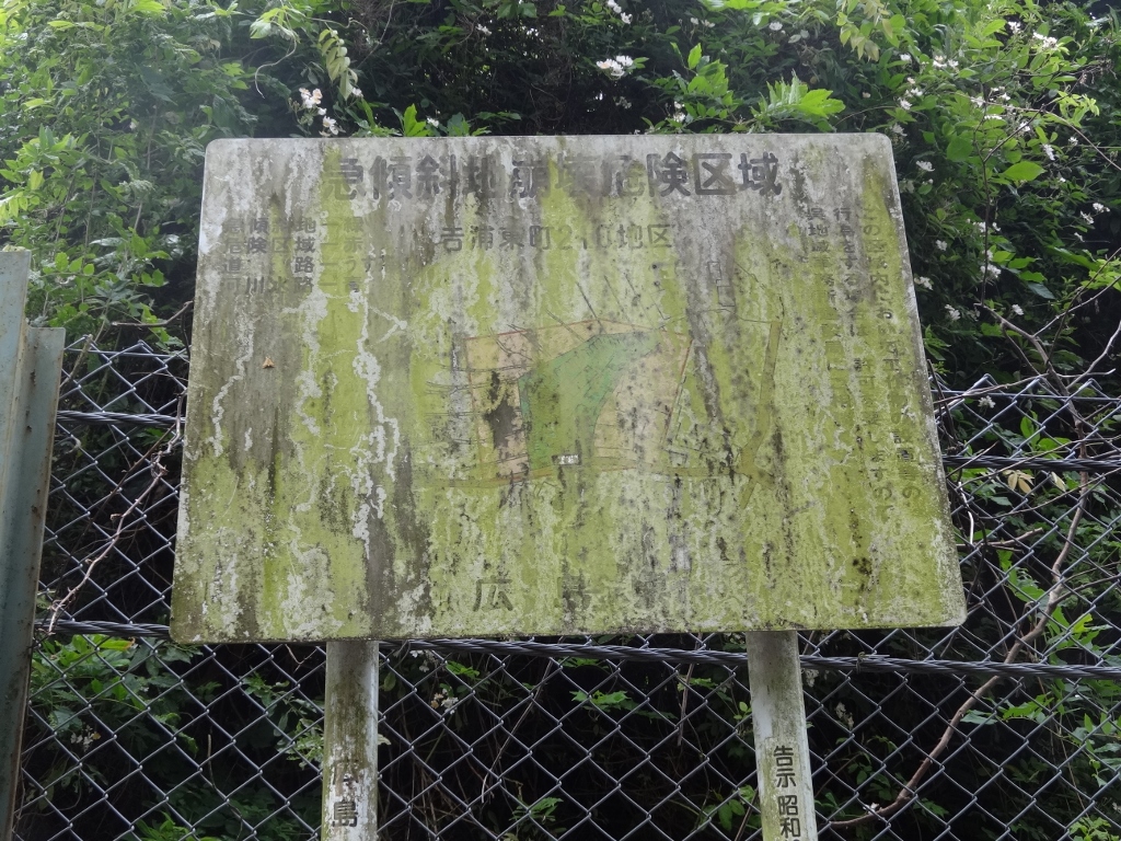 かなり風化した上流の表示板には、「急傾斜地崩壊危険区域 吉浦東210地区」と判読できた。