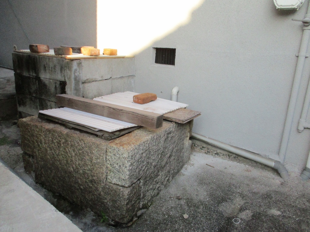 井戸は家に一つなのがフツーですよね。ところが、コイのいるここのお屋敷では、フラットな井戸のほかに、どっしりとした石囲いの井戸もありました。聞けば、ず、ずーっと昔には、もう一つ、つまり全部で3つも井戸があったそうな。
