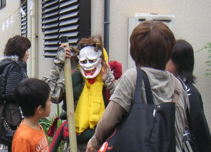 神社境内にたむろする赤鬼、青鬼、白鬼・・。カニ祭りでは、各自治会が繰り出す趣向をこらしたおみこしや笛太鼓列を先導します。露祓いの意味があるんですね。時には、路上で幼児を突然抱っこすることもあります(吉浦西城町)