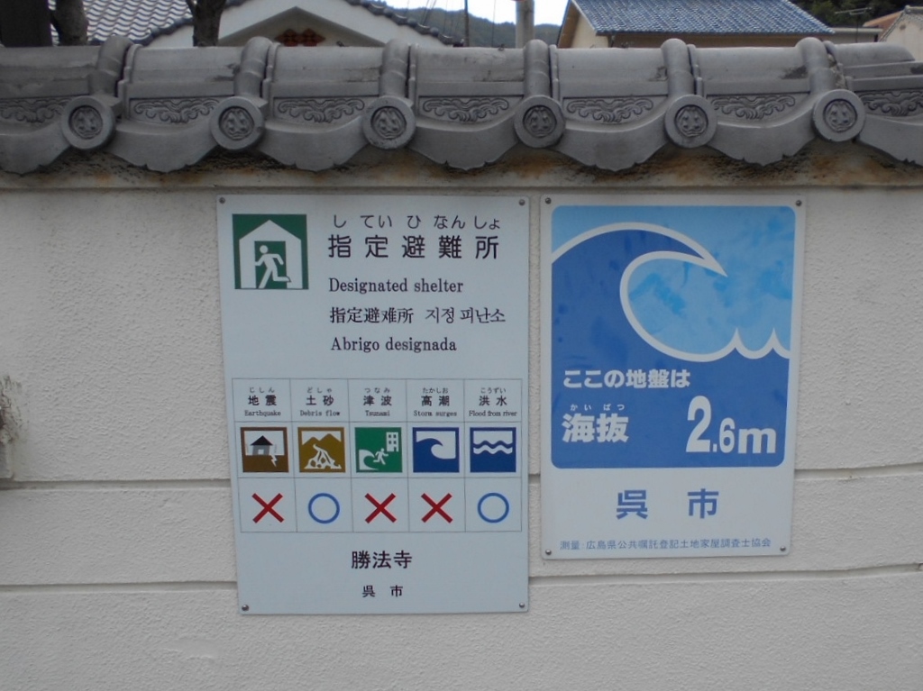 勝法寺の外の白壁に、海抜は2.6mと表示してあります。そして、このお寺は、土砂災害と洪水の指定避難所であることがわかります。地震、津波、高潮の避難所としては指定されていないということですね。表示板を見て覚えたようでも、目をはずせば、どういう時の避難指定所なのか、もう忘れてしまいます。日本語、英語、中国語、韓国語、ポルトガル語で記されていました。